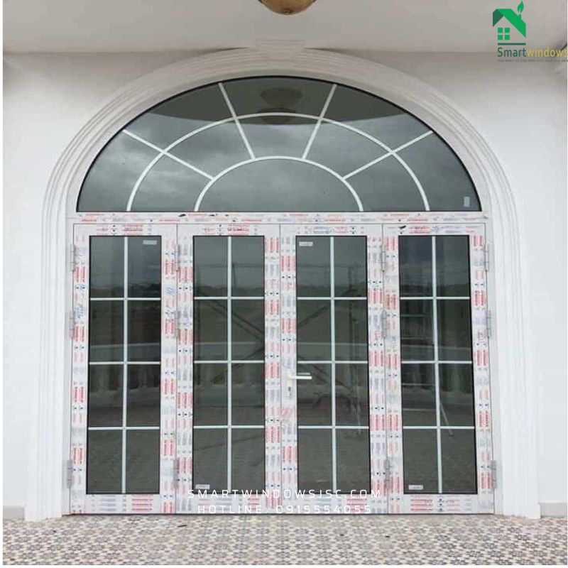 Văn phòng tại Nguyễn Thái Học: Cửa mở quay nhôm Xingfa màu trắng sứ, có uốn vòm