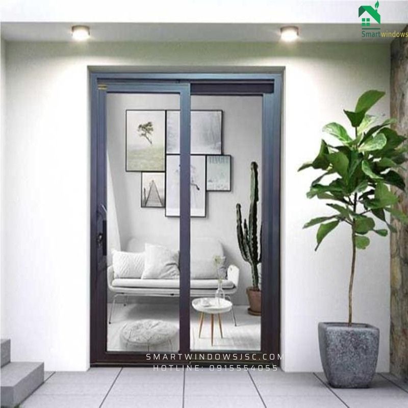 Phong cách tối giản (Minimalism): cửa nhôm kính khung mảnh, màu ghi/đen.
