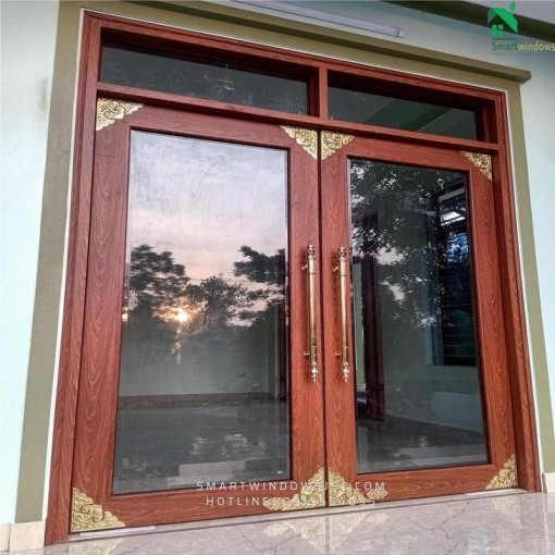2. Mẫu cửa nhôm thủy lực màu vân gỗ trắc sử dụng kính hộp 19mm nan đồng