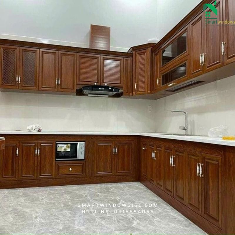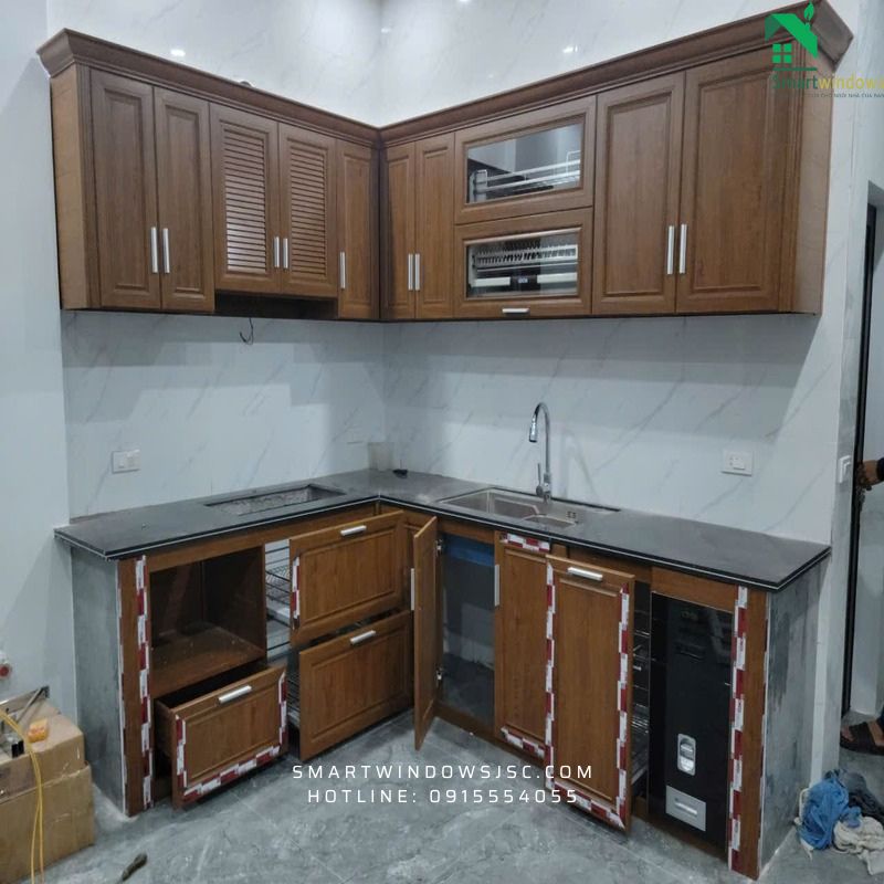 2. Tủ bếp nhôm Omega chữ L – Tận dụng góc hiệu quả